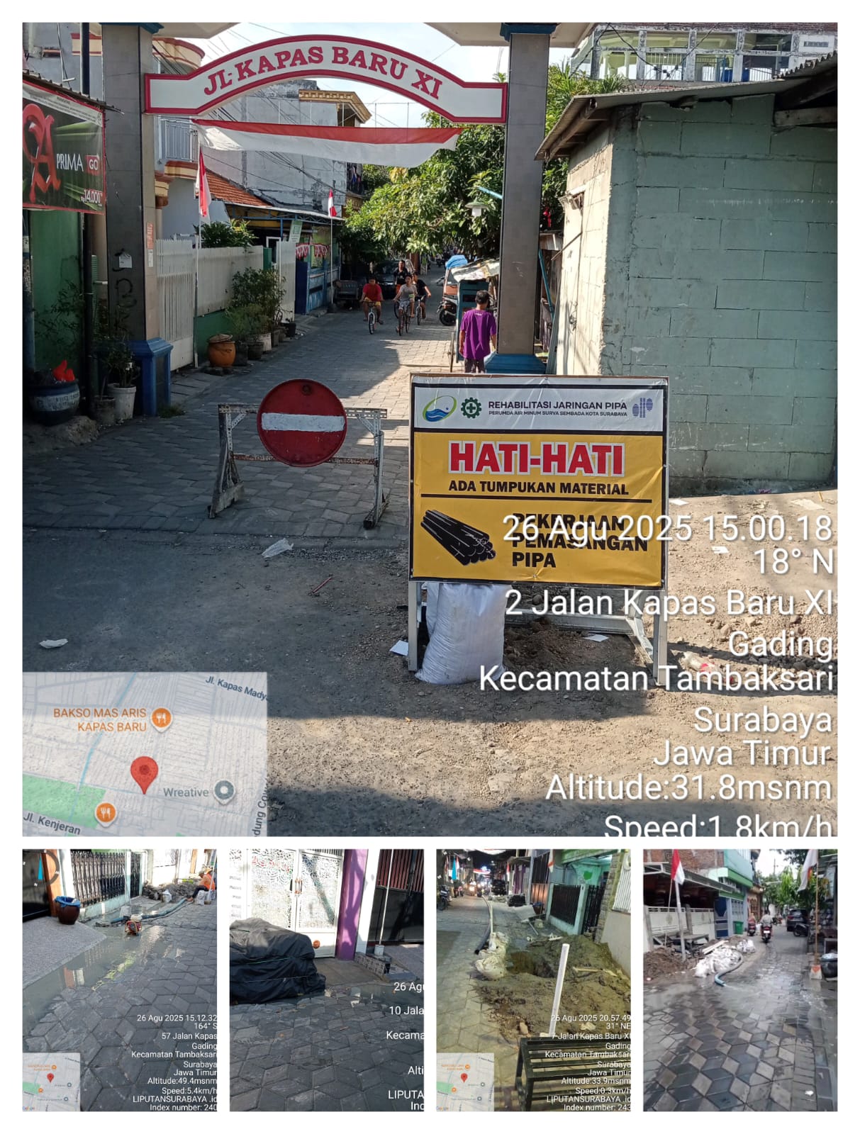 Surabaya, Potretrealita.com – Warga Jalan Kapas Baru Gang 11, RT 14 RW 18, Kelurahan Kapas Madya Baru, Kecamatan Tambaksari, mengeluhkan proyek penggalian saluran PDAM. Pasalnya, galian tersebut menyebabkan air bercampur lumpur meluap ke jalan hingga membahayakan pengguna jalan yang melintas.