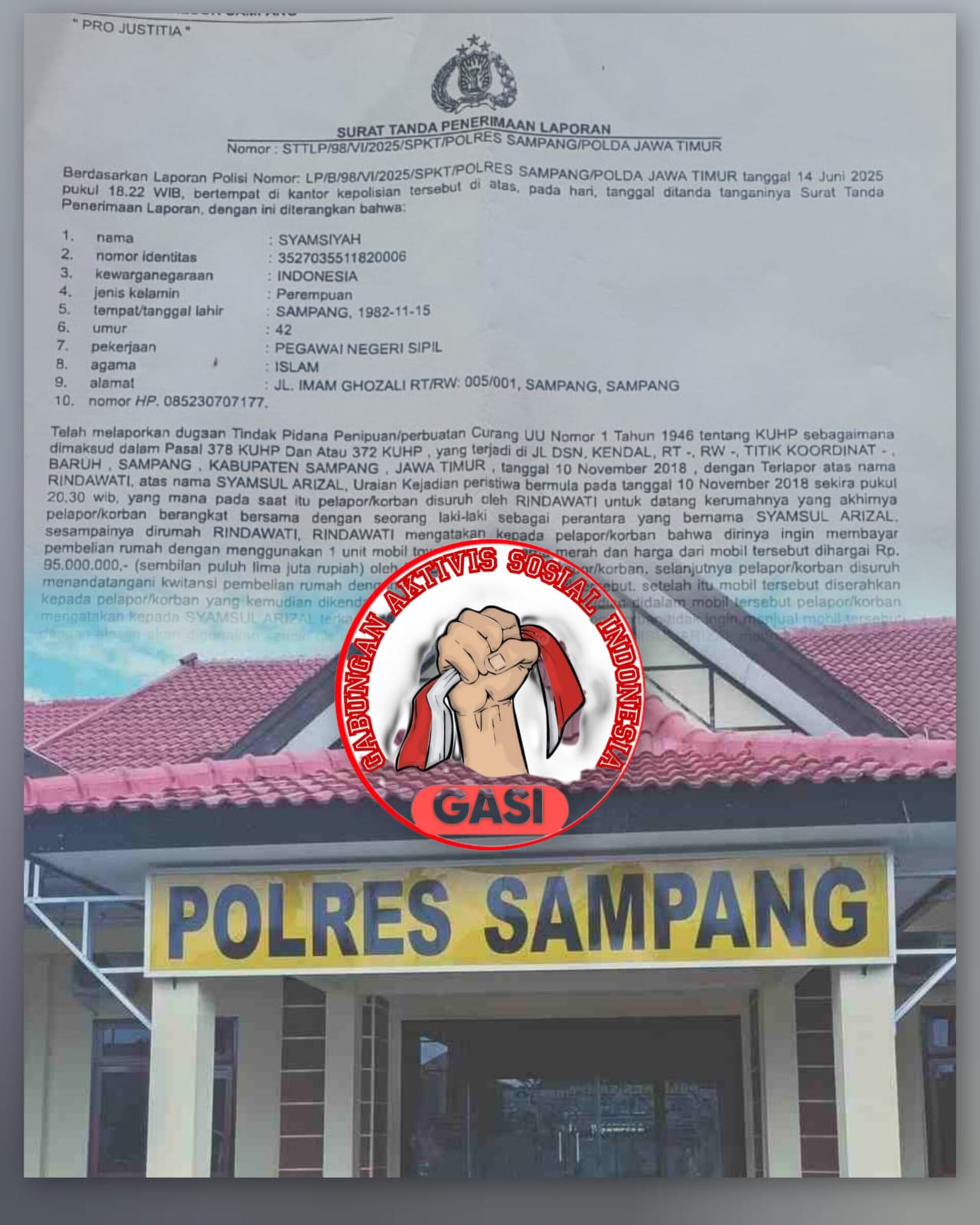 Sampang, Potretrealita.com – Kepercayaan publik kembali diuji. Laporan dugaan tindak pidana penipuan di Polres Sampang terkesan jalan di tempat. Dilaporkan sejak 14 Juni 2025 dengan nomor STTLP/98/VI/2025/SPKT/POLRES SAMPANG/POLDA JAWA TIMUR, hingga kini belum ada kepastian hukum.