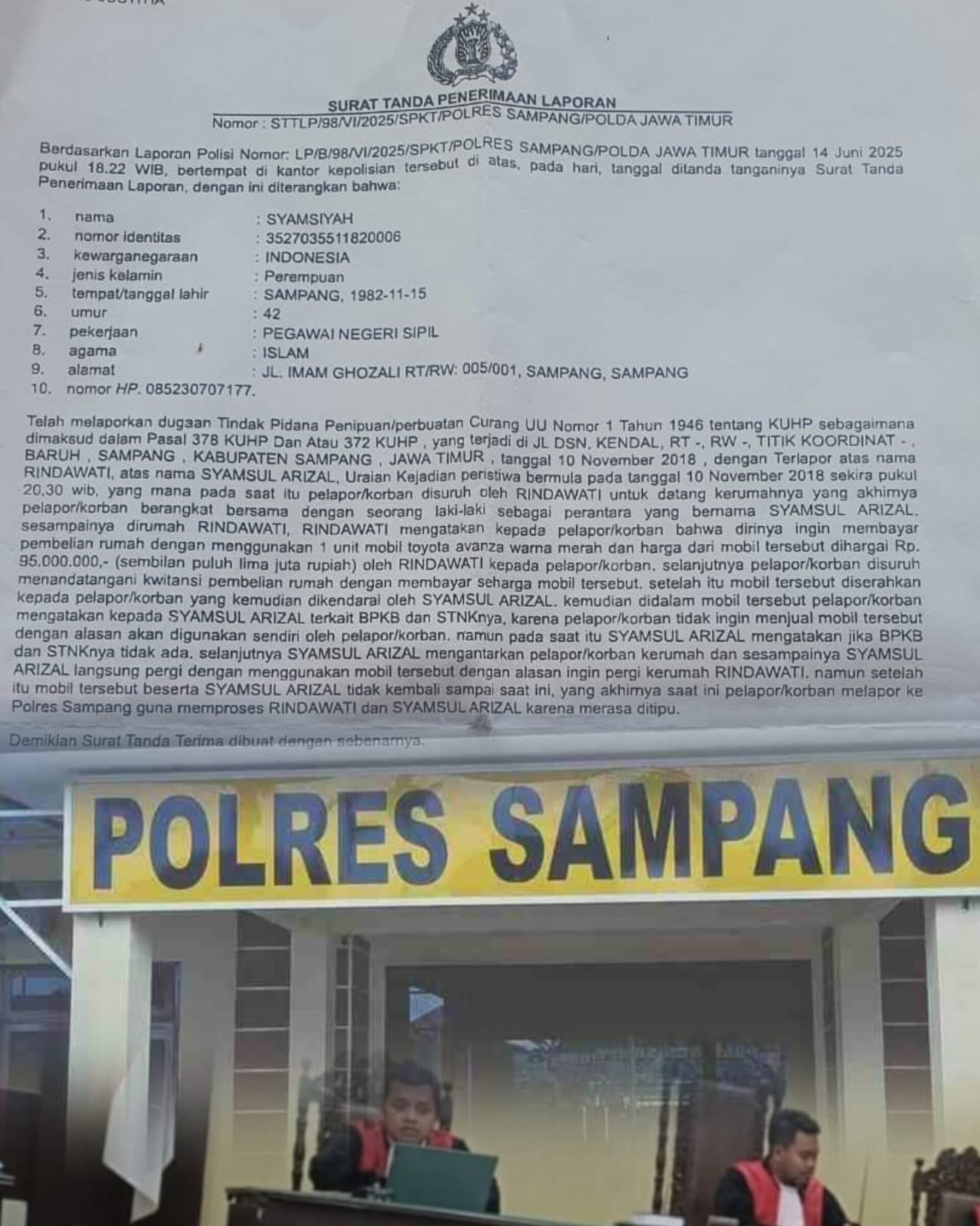 Tak tinggal diam, Syamsiah resmi melaporkan Rindawati dan Rizal Berdasarkan surat pelaporan tertanggal 14 Juni 2025 dengan Nomor: STTLP/98/VI/2025/SPKT/Polres Sampang/Polda Jawa Timur, Rindawati diduga melakukan tindak pidana/perbuatan curang sebagaimana diatur dalam UU Nomor 1 Tahun 1946 tentang KUHP, pasal 378 KUHP atau 373 KUHP.
