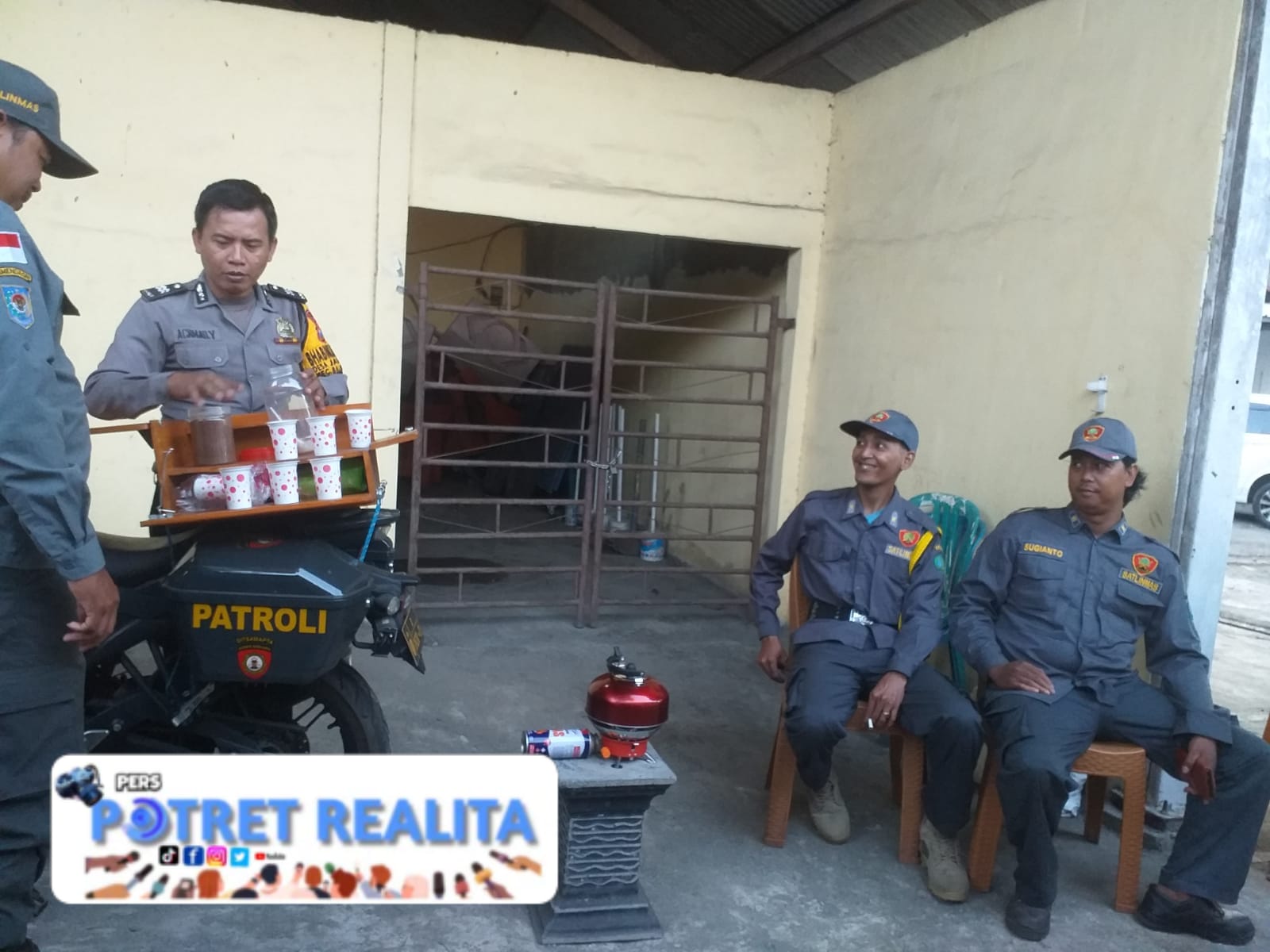 Anggota Bhabinkamtibmas dengan motor patroli yang dimodifikasi untuk tempat kopi mengajak warga ngopi bareng sambil menyampaikan pesan kamtibmas dan menyerap aspirasi warga di tingkat bawah.