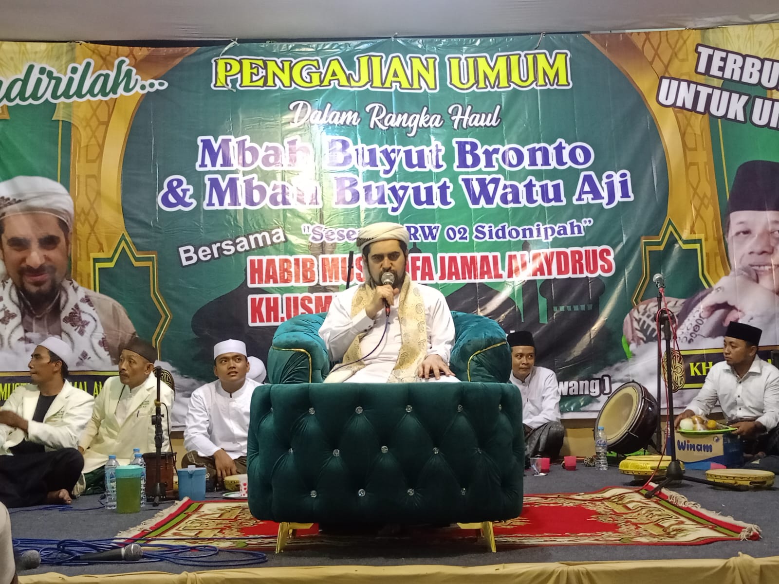 Puncak acara diisi tausiyah oleh dua muballigh besar, yakni Habib Mustofa Jamal Alaydrus dan KH. Usman Yunus. Dalam ceramahnya, Habib Mustofa mengingatkan bahwa haul bukan sekadar mengenang nama leluhur, tetapi meneladani amal kebaikan yang mereka tinggalkan. “Memperingati Maulid Nabi adalah bukti cinta kita kepada Rasulullah. Semoga acara ini menjadi jalan turunnya rahmat dan keberkahan Allah SWT,” pesannya.
