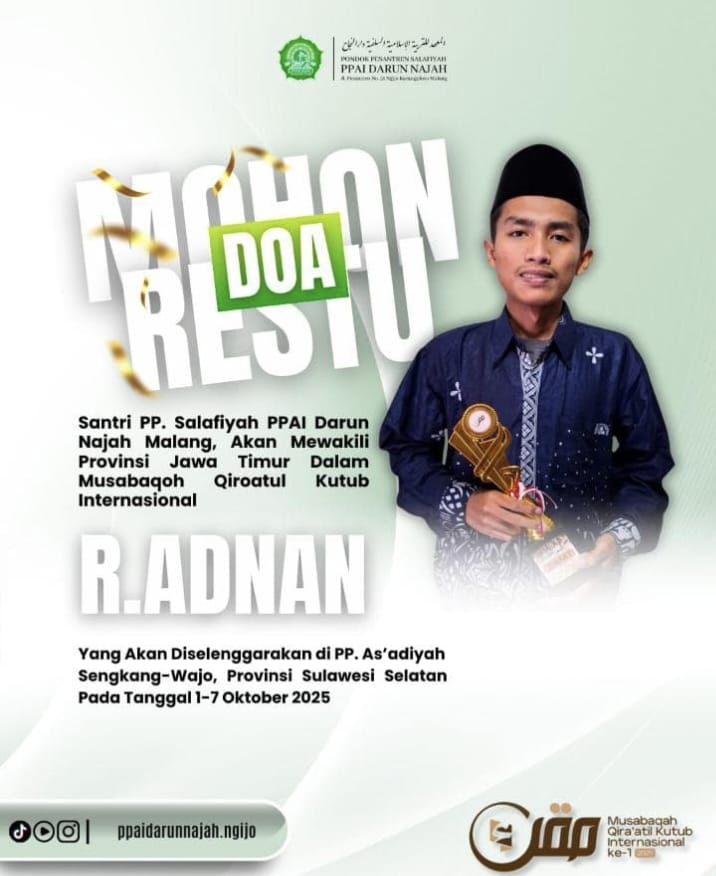 Sampang, Potretrealita.com – Rola Adnan Asal kelahiran kota sampang Santri Pondok Pesantren Salafiyah PPAI Darun Najah, Malang, akan mewakili Provinsi Jawa Timur dalam ajang bergengsi Musabaqoh Qiroatul Kutub (MQK) tingkat internasional. Kompetisi tersebut rencananya akan diadakan di Pondok Pesantren As’adiyah, Sengkang, Kabupaten Wajo, Provinsi Sulawesi Selatan, pada tanggal 1 hingga 7 Oktober 2025.