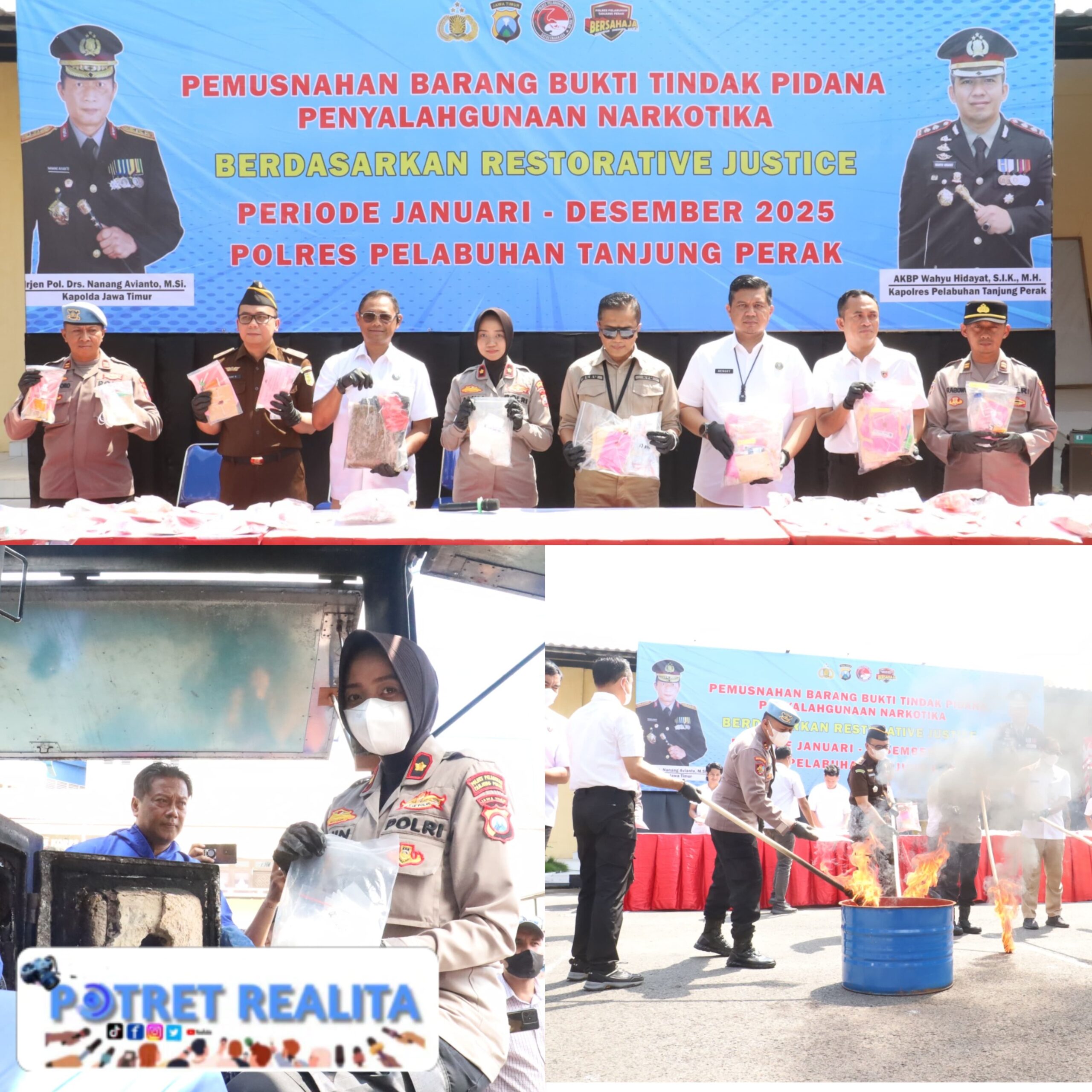 Tanjungperak, Potretrealita.com – Polres Pelabuhan Tanjung Perak menggelar pemusnahan barang bukti hasil tindak pidana penyalahgunaan narkotika periode Januari hingga Desember 2025. Kegiatan pemusnahan ini digelar secara terbuka di halaman Mapolres Pelabuhan Tanjung Perak, Rabu (10/12/2025).