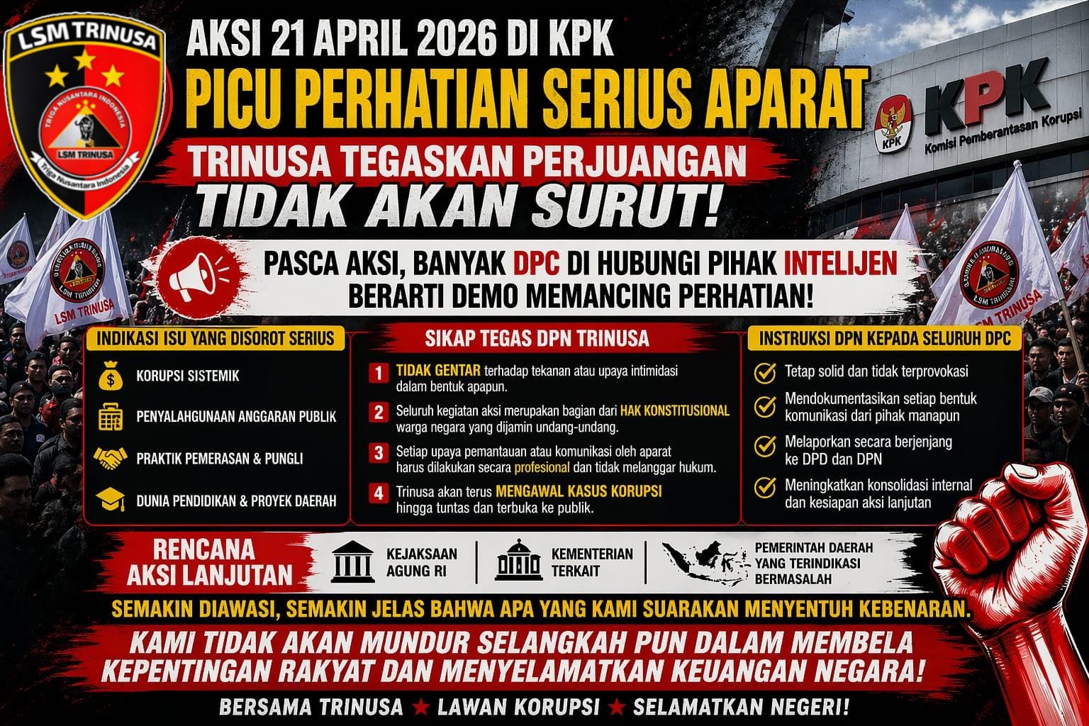 Jakarta, Potretrealita.com – Aksi unjuk rasa yang digelar jajaran Dewan Pimpinan Cabang (DPC) LSM Triga Nusantara Indonesia di depan kantor Komisi Pemberantasan Korupsi (KPK), Selasa (21/4/2026), memicu perhatian luas, termasuk dari aparat intelijen di sejumlah daerah.