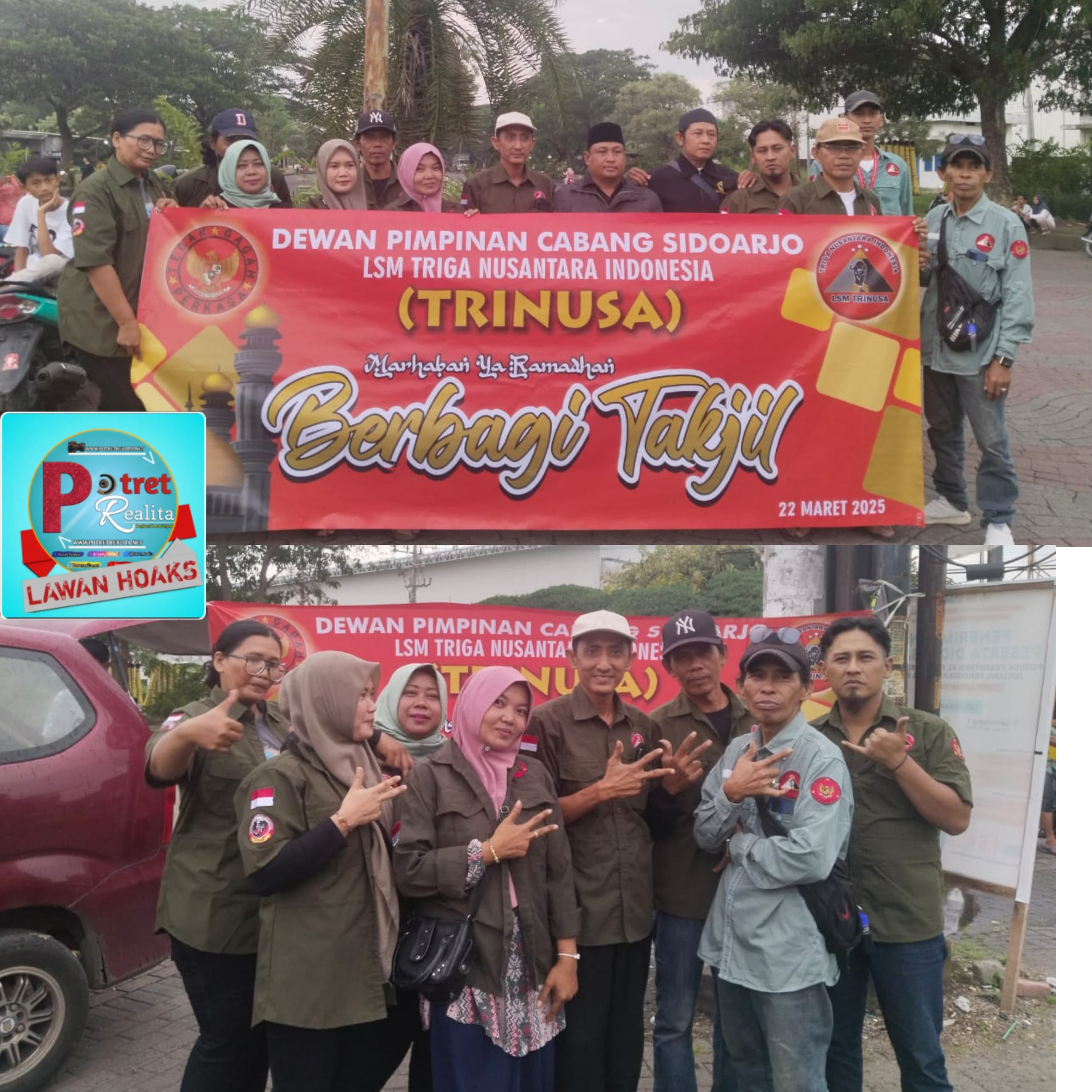 Sidoarjo, Potretrealita.com – Sabtu (22/03/2025) – Lembaga Swadaya Masyarakat (LSM) Triga Nusantara Indonesia (Trinusa) kembali menggelar aksi sosial dengan membagikan 500 paket takjil di depan Pasar Puspo Agro, Jemundo, Sidoarjo. Kegiatan yang dipimpin oleh Ketua DPC Sidoarjo, Nasrulloh atau yang akrab disapa Nasrul, ini diikuti oleh 27 anggota serta perwakilan dari DPC Surabaya, Muswargiyo (Sekjen LSM Trinusa) dan Suwarno (anggota DPC Surabaya).